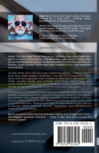 Hotel on the Edge is the story of an ordinary man who finds himself in a world where reality and absurdity walk hand in hand. Alex, an accidental guest on the border between the familiar and the unknown, faces surreal challenges that transform him and everyone around him. By a twist of fate, Alex finds himself caught up in absurd yet unsettling events unfolding at the Hotel-a place where mysticism and sarcasm mask deeper, hidden secrets. At the Hotel, he meets Kate and Jane, who, like Alex, are able to sense the absurdity of their surroundings-unlike the other guests, for whom this environment seems perfectly normal. Soon, they realize that multiple mysterious factions are trying to use them in their struggle for control of the Hotel. Meanwhile, the Hotel itself and even its simplest objects turn out to be far more than they appear. Their attempt to unravel the secrets of the enigmatic Hotel takes Alex and his companions to parallel universes inhabited by strange and otherworldly beings. Here, every step feels like walking through a minefield-demanding careful analysis and planning, quick improvisation, or, at times, a dangerous game of Russian roulette. This story is a cocktail of humor, sarcasm, a dash of carefree mischief, and an unending quest for truth. An adventure awaits on the boundary between the ordinary and the fantastic, where laughter and fear are two sides of the same coin. Blending suspense, dark humor, and a hint of mysticism, Hotel on the Edge invites readers to join Alex on a journey where personal growth, friendship, and self-discovery meet the extraordinary. But in a world where the line between reality and imagination blurs, the biggest question remains - what is real, and what is just the Hotel's Game?