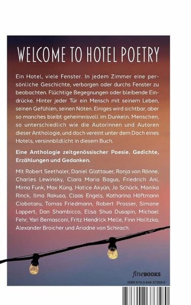 WELCOME TO THE HOTEL POETRY. Ein Hotel, viele Fenster. In jedem Zimmer eine persönliche Geschichte, verborgen oder durchs Fenster zu beobachten. Flüchtige Begegnungen oder bleibende Eindrücke. Hinter jeder Tür ein Mensch mit seinem Leben, seinen Gefühlen, seinen Nöten. Einiges wird sichtbar, aber so manches bleibt geheimnisvoll im Dunkeln. Menschen, so unterschiedlich wie die Autorinnen und Autoren dieser Anthologie, und doch vereint unter dem Dach eines Hotels, versinnbildlicht in diesem Buch.Eine Anthologie zeitgenössischer Poesie. Gedichte, Erzählungen und Gedanken. Mit Robert Seethaler, Daniel Glattauer, Ronja von Rönne, Charles Lewinsky, Clara Maria Bagus, Friedrich Ani, Mirna Funk, Max Küng, Hatice Akyün, Jo Schück, Monika Rinck, Ilma Rakusa, Claas Engels, Katharina Höftmann Ciobo taru, Thomas Friedmann, Robert Prosser, Simone Lappert, Dan Shambicco, Elisa Shua Dusapin, Michael Fehr, Yari Bernasconi, Fritz Hendrick Melle, Finn Holitzka, Alexander Broicher und Ariadne von Schirach._Die beiden vorliegenden Editionen sind inhaltsgleich_