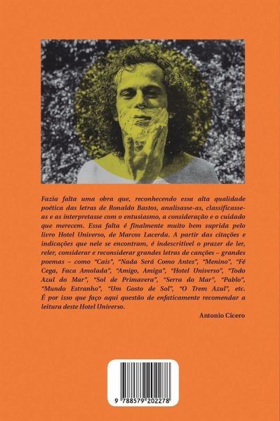 Ronaldo Bastos é um dos principais compositores da canção brasileira. Consegue estar ao mesmo tempo no centro da tradição mais sofisticada e inventiva da canção brasileira e ser também uma espécie de estrangeiro para esta mesma tradição. Ele foi um dos criadores e conceituadores mais destacados do Clube da Esquina, o movimento musical que revolucionou a poética e a estética da canção brasileira e teve como expoentes artistas do porte de Milton Nascimento, Beto Guedes e Lô Borges. Suas canções foram gravadas por nomes como Caetano Veloso, Elis Regina, Tom Jobim, Edu Lobo, Gal Costa, Maria Bethânia, Adriana Calcanhotto. Hotel Universo traz uma antologia e uma análise profunda do cancioneiro e da lírica de Ronaldo Bastos, realizada por Marcos Lacerda, importante crítico musical da nova geração.