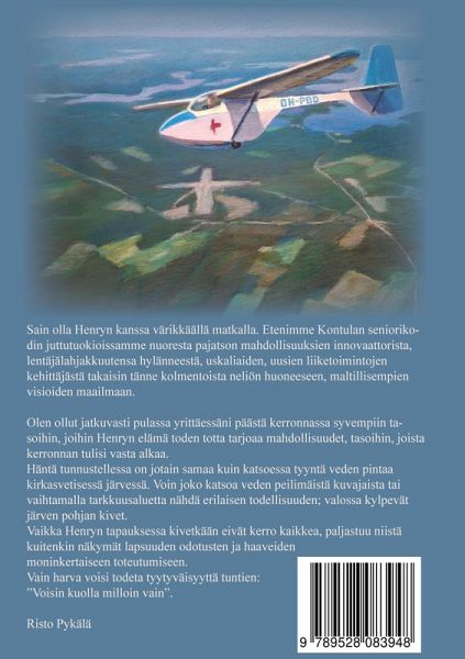 Sain olla Henryn kanssa värikkäällä matkalla. Etenimme Kontulan seniorikodin juttutuokioissamme nuoresta pajatson mahdollisuuksien innovaattorista, lentäjälahjakkuutensa hylänneestä, uskaliaiden, uusien liiketoimintojen kehittäjästä takaisin tänne kolmentoista neliön huoneeseen, maltillisempien visioiden maailmaan. Olen ollut jatkuvasti pulassa yrittäessäni päästä kerronnassa syvempiin tasoihin, joihin Henryn elämä toden totta tarjoaa mahdollisuudet, tasoihin, joista kerronnan tulisi vasta alkaa. Häntä tunnustellessa on jotain samaa kuin katsoessa tyyntä veden pintaa kirkasvetisessä järvessä. Voin joko katsoa veden peilimäistä kuvajaista tai vaihtamalla tarkkuusaluetta nähdä erilaisen todellisuuden; valossa kylpevät järven pohjan kivet. Vaikka Henryn tapauksessa kivetkään eivät kerro kaikkea, paljastuu niistä kuitenkin näkymät lapsuuden odotusten ja haaveiden moninkertaiseen toteutumiseen. Vain harva voisi todeta tyytyväisyyttä tuntien: Voisin kuolla milloin vain.