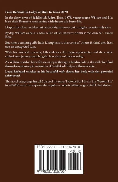 From Barmaid To Lady For Hire' In Texas 1879! In the dusty town of Saddleback Ridge, Texas, 1879, young couple William and Lila leave their Tennessee roots behind with dreams of a better life. Despite their love and determination, this passionate pair struggles to make ends meet. By day, William works as a bank teller, while Lila serves drinks at the town bar - Faded Rose. But when a tempting offer leads Lila upstairs to the rooms of 'whores for hire', their lives take an unexpected turn. With her husband's consent, Lila embraces this risqué opportunity, and the couple embark on a journey stretching the boundaries of their marriage. As William watches his wife's secret trysts through a hidden hole in the wall, they find themselves attracting the attention of Saddleback Ridge's influential elite. Loyal husband watches as his beautiful wife shares her body with the powerful aristocrats! This novel brings together all 3 parts of the series 'Hotwife For Hire In The Western Era' in a 60,000 story that explores the lengths a couple is willing to go to fulfil their desires
