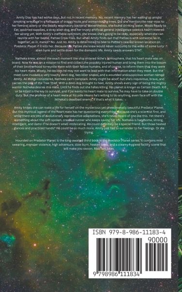 On Predator Planet, no one comes to your rescue ... except yourself. Amity Diaz has had worse days, but not in recent memory. No, recent memory has her waking up amidst smoking wreckage in a hellscape of craggy rocks and woman-eating trees. Did she mention the near-miss to her femoral artery or the deadly respiratory bacteria? Nevertheless, she found drinking water, Meals Ready to Eat, assorted supplies, a stray alien dog, and her trusty artificial general intelligence sidekick hasn't steered her wrong yet. With Amity's ineffable optimism, she knows she's going to be okay, especially when she can reunite with her bestie, Pattee Crow Flies. But when Amity finds out that Pattee is with someone, as in, together, as in, mated? No. Just no. Amity is determined to hike to Pattee's nearest known location on Predator Planet if it kills her. Because the Pattee she knew would never succumb to the wiles of some lusty alien hunk and settle down for the domestic life. Amity needs answers STAT. Natheka knew, almost the exact moment the ship entered Ikthe's atmosphere, that his heart mate was on board. Now he was on a mission to find and collect the possibly injured human and bring them into the bosom of their brotherhood to reunite them with their fellow humans, and of course, to inform them that they were his heart mate. Wisely, he decides he may not want to lead with that information when they meet. But the meet cute involves a very touchy devil dog, two killer snakes, and a wounded and suspicious woman named Amity. All things considered, Natheka can't complain. Amity might be aloof, but she's inquisitive, brave, and carries the pelt of the Tree Thief. With a devil dog brought to heel, Amity shows every sign of being the mighty warrior Natheka desires in a mate. Until he finds out she hates killing. His planet is known as Certain Death. Kill or be killed is the key to survival, and if he wants his heart mate to survive, he may have to take on double duty. But the promise of a heart mate at his side means he's willing to do anything, even face off with the Ikthekal's deadliest enemy, if that's what it takes. Amity knows she can make a life for herself on the mysterious yet phenomenally beautiful Predator Planet. But this mythical legend of the heart mate has her questioning everything. Because she's a scientist first, and while there are lots of evolutionary reproductive adaptations, she's never heard of one like this. Yet there's something about the soft-spoken, creative runner who keeps saving her life. Natheka is handsome, strong, intelligent, and damn if he doesn't smell intoxicating. He could definitely be a special friend. But those heated glances and practiced hands? He could be so much more. Amity just has to surrender to her feelings. Or die trying. Hounded on Predator Planet is the long-awaited third book in the Predator Planet series. It contains mild swearing, monster violence, high adventure, slow burn, heated looks, and a steamy hygiene facility scene that will make you swoon. Also fart jokes.