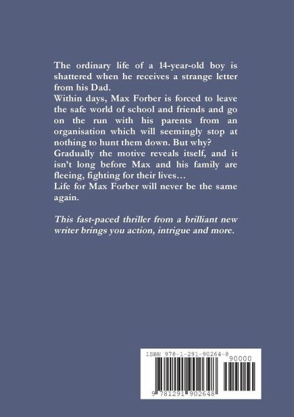 The ordinary life of a 14-year-old boy is shattered when he receives a strange letter from his Dad. Within days, Max Forber is forced to leave the safe world of school and friends and go on the run with his parents from an organisation which will seemingly stop at nothing to hunt them down. But why? Gradually the motive reveals itself, and it isn't long before Max and his family are fleeing, fighting for their lives... Life for Max Forber will never be the same again. This fast-paced thriller from a brilliant new writer brings you action, intrigue and more.