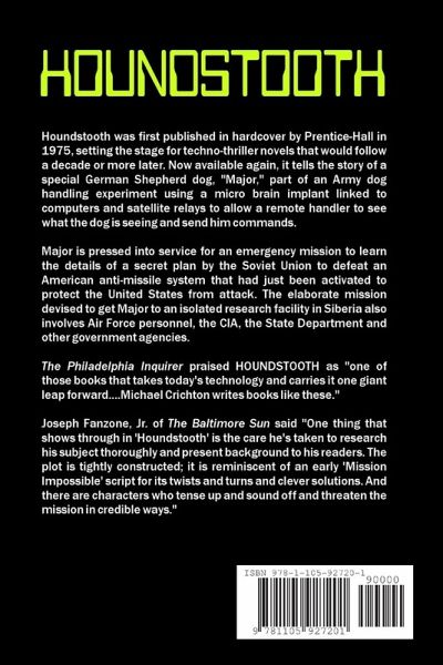 HOUNDSTOOTH set the stage for techno-thriller novels that would follow a decade or more later. It's the story of a special German Shepherd dog, "Major," part of an Army dog handling experiment using a micro brain implant linked to computers and satellite relays to allow a remote handler to see what the dog is seeing and send him commands. Major is sent on an emergency spy mission deep into Russia. The Philadelphia Inquirer praised HOUNDSTOOTH as "one of those books that takes today's technology and carries it one giant leap forward....Michael Crichton writes books like these." Joseph Fanzone, Jr. of The Baltimore Sun said "One thing that shows through in 'Houndstooth' is the care he's taken to research his subject thoroughly and present background to his readers. The plot is tightly constructed; it is reminiscent of an early 'Mission Impossible' script for its twists and turns and clever solutions. And there are characters who tense up and sound off and threaten the mission in credible ways."