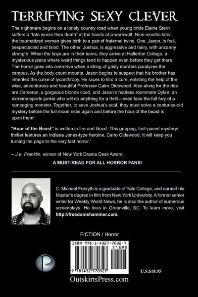 The nightmare begins on a lonely country road when young bride Elaine Stern suffers "a fate worse than death" at the hands of a werewolf. Nine months later, the traumatized woman gives birth to a pair of fraternal twins. One, Jason, is frail, bespectacled and timid. The other, Joshua, is aggressive and hairy, with uncanny strength. When the boys are in their teens, they arrive at Hallerton College, a mysterious place where weird things tend to happen even before they get there. The horror goes into overdrive when a string of grisly murders paralyzes the campus. As the body count mounts, Jason begins to suspect that his brother has inherited the curse of lycanthropy. He races to find a cure, enlisting the help of the wise, adventurous and beautiful Professor Cairo Oldewood. Also along for the ride are Cameron, a gorgeous blonde coed, and Jason's roommate Dylan, a fearless extreme-sports junkie who will do anything for a thrill, even face the full fury of a rampaging monster. Together, to save Joshua's soul, they must solve a centuries-old mystery before the full moon rises again, and before the hour of the beast is upon them! "Hour of the Beast is written in fire and blood. This gripping, fast-paced mystery/thriller features an Indiana Jones-type heroine, Cairo Oldewood. It will keep you turning the page to the very last horror." -- J.e. Franklin, winner of New York Drama Desk Award. Fast-paced and tightly written, Hour of the Beast is a terrifying roller-coaster ride through Hell and back. From the opening scene of indescribable horror to its nail-biting climax on a snow-enshrouded mountain, the tale grabs you by the throat and never lets go. The book introduces a unique horror heroine: Professor Cairo Oldewood, a globe-trotting female Indiana Jones. This charismatic character is intriguing enough to spawn a book series of her own- provided she survives, of course. The author is a former writer for the infamous tabloid Weekly World News, best known for its wacky headlines like "Bat Boy Escapes" and "Alien Backs Clinton." So, as one might expect, the novel is laced with black, subversive humor. Some of the college students' wisecracks and use of slang (banishing your roommate so you can have sex in privacy is known as "sexiling") will make the reader laugh out loud. Yet the book is meticulously researched and delves seriously into werewolf lore. In its pages one finds everything from the origins of lycanthropy in Greco-Roman cults to its bizarre link to LSD produced in bread mold. And, though it delivers the requisite blood, gore and chills in spades, Hour of the Beast is more than just a horror novel. The author is a Yale graduate with a degree in English Literature and it shows. The work is full of sly historical and literary allusions (Hallerton College is a nod to Harry Haller, the protagonist of Herman Hesse's Steppenwolf). In many ways, the book is a thought-provoking exploration of the nature of good and evil in a man. The novel has its share of steamy moments. Some scenes between Cameron and one of the brothers will certainly get readers' pulses pounding. But, despite an opening rape scene--which is tastefully executed, there is nothing in this book to offend the typical adult or young adult reader. Reminiscent of the early novels of Stephen King, such as Salem's Lot, Hour of the Beast is a masterpiece of modern horror. Beyond the fright factor, the book's characters are three-dimensional and fascinating--you actually care about them. This book will appeal to hardcore horror fans and to people who prefer their chillers with a dose of intellect. The folks who like the works of Charlaine Harris (author of the Sookie Stackhouse books that are the basis of the HBO series "True Blood") will love this scary, smart, sexy novel.