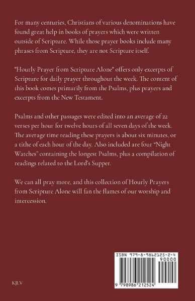 This collection of prayers should not replace spontaneous praying, but serve as kindling for the fire of prayer. For many centuries, Christians of various denominations have found great help in books of prayers which were written outside of Scripture. While those prayer books include many phrases from Scripture, they are not Scripture itself. "Hourly Prayer from Scripture Alone" offers only excerpts of Scripture for every hour throughout the week. The content of this book comes primarily from the Psalms, plus prayers of the New Testament, and excerpts of verses which can be prayed as confessions of faith. Psalms and other passages were edited into an average of 22 verses per hour for an average reading time of six minutes, or a tithe of each hour of the day. Also included are four "Night Watches" containing the longest Psalms, plus a compilation of readings related to the Lord's Supper. We can all pray more, and this collection of Hourly Prayers from Scripture Alone will fan the flames of our worship and intercession.
