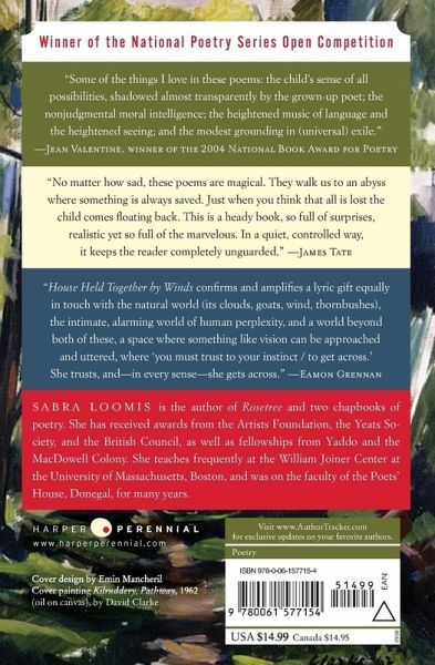"These are my songlines; they helped me to re-connect with the landscape, and with my own life," says Sabra Loomis of the poems which appear in House Held Together by Winds. Winner of the 2007 National Poetry Series Open Competition as selected by James Tate (winner of the Pulitzer Prize and National Book Award), Sabra's work perpetuates NPS's tradition of promoting exceptional poetry from lesser known poets. For over twenty years, the National Poetry Series has discovered many new and emerging voices and has been instrumental in launching the careers of poets and writers such as Billy Collins, Mark Doty, Denis Johnson, Cole Swensen, Thylias Moss, Mark Levine, and Dionisio Martinez.