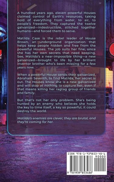 A hundred years ago, eleven powerful Houses claimed control of Earth's resources, taking hold of everything from water, to air, to people's freedom. They captured the twelve galvanized-indestructible, stitched together humans-and forced them to serve. Matilda Case is the rebel leader of House Brown, an underground organization that helps keep people hidden and free from the powerful Houses. The job suits her fine, since she has her own secrets that need keeping. See, Matilda's a near-impossible thing-a new galvanized-brought to life by her brilliant inventor brother who's been missing for a few years now. When a powerful House sends their galvanized, Abraham Seventh, to find Matilda, her secret is out. The Houses know she is a new galvanized and will stop at nothing to capture her, even if that means killing her ragtag group of friends and family. But that's not her only problem. She's being hunted by an enemy who believes she holds the key to time itself, a key so powerful, it could destroy the world. Matilda's enemies are clever, they are brutal, and they're coming for her....