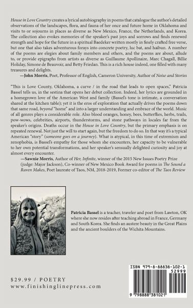 House in Love Country is a poetry collection that carries us through childhood, coming of age and adulthood with an intense search for love. A literal and metaphorical journey to the far reaches of the senses and the heart of memory, in this house, juxtaposing the warmth and comfort of family and its inevitable loss, we long to return to our first loves: the natural world, pets, play and life on the farm. Inexorably we give birth to new loves like art, Billie Holiday, travel, and the deeply-rooted human desire to break free. (Love even leads us into the kitchen where Proust casts his spell.) Deaths occur but the primary emphasis is on repeated renewal -- not just the will to start again, but the freedom to do so. Many poems have a strong feeling of the American West, a mix of tribal, cowboy and agrarian cultures. Paris, Nice, Amsterdam, San Juan and Kyoto also become part of the journey. We search for truths on "rough terrain and slippery rocks" and discover "the power of nature lies in its tender words and delicate touches." Like Chagall, House in Love Country takes us "off the interstate" to a full, open life of adventure, discovery, loss, and love in its multitude of expressions.