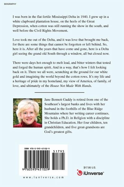 I was born in the flat fertile Mississippi Delta in 1940. I grew up in a white clapboard plantation house, on the heels of the Great Depression, when cotton was still running the show in the south, and well before the Civil Rights Movement. Love took me out of the Delta, and it was love that brought me back, for there are some things that cannot be forgotten or left behind. So, here it is. After all the years that have come and gone, here is a Delta girl seeing the grand old South through a window, all but closed now. There were days hot enough to melt lead, and bitter winters that tested and forged the human spirit. And in a way, that's how I felt looking back on it. There we all were, scratching at the ground for our white gold and imagining the world beyond the cotton rows. It's my life and a heritage of pride in my homeland, my view of America, of family, of love, and ultimately of the House Not Made With Hands.