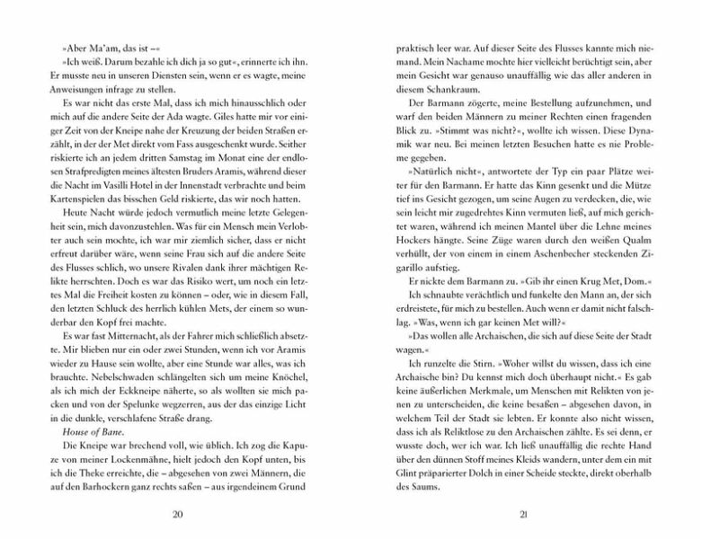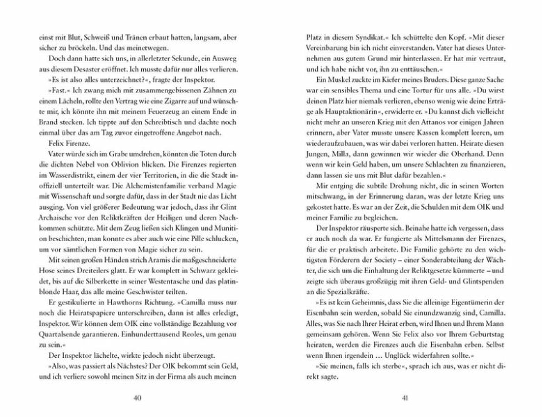 Camilla weiß, dass sie ihm nicht trauen kann. Doch Nico hat seine eigenen Beweggründe für ihre Verbindung: Ein Serienentführer, bekannt als "der Sammler", treibt in den dunklen Gassen der Stadt sein Unwesen und schürt das Misstrauen zwischen den Einheimischen und den unterdrückten Reliktern - Menschen mit der Gabe, die Elemente, Licht und Schatten, Zeit und andere Menschen magisch zu beeinflussen. Milla soll ihm helfen, den Täter zu fassen und den drohenden Krieg zwischen den Stadtteilen zu verhindern. Gelingt ihr das, könnte sie mehr Freiheit gewinnen, als sie je zu träumen gewagt hat.