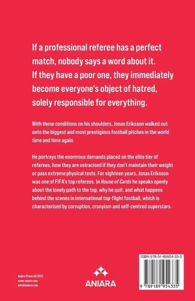 If a professional referee has a perfect match, nobody says a word about it. If they have a poor one, they immediately become everyone's object of hatred, solely responsible for everything.With these conditions on his shoulders, Jonas Eriksson walked out onto the biggest and most prestigious football pitches in the world time and time again. He portrays the enormous demands placed on the elite tier of referees, how they are ostracised if they don't maintain their weight or pass extreme physical tests.For eighteen years, Jonas Eriksson was one of FIFA's top referees. In House of Cards he speaks openly about the lonely path to the top, why he quit, and what happens behind the scenes in international top-flight football, which is characterised by corruption, cronyism and self-centred superstars.