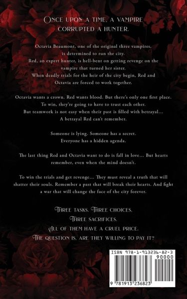 Once upon a time, a vampire corrupted a hunter. Octavia Beaumont, one of the original three vampires, is determined to run the city. Red, an expert hunter, is hell-bent on getting revenge on the vampire that turned her sister. When deadly trials for the heir of the city begin, Red and Octavia are forced to work together. Octavia wants a crown. Red wants blood. But there's only one first place. To win, they're going to have to trust each other. But teamwork is not easy when their past is filled with betrayal... A betrayal Red can't remember. Someone is lying. Someone has a secret. Everyone has a hidden agenda. The last thing Red and Octavia want to do is fall in love... But hearts remember, even when the mind doesn't. To win the trials and get revenge... They must reveal a truth that will shatter their souls. Remember a past that will break their hearts. And fight a war that will change the face of the city forever. Three tasks. Three choices. Three sacrifices. All of them have a cruel price. The question is, are they willing to pay it? This is a very steamy lesbian vampire romance with a sprinkling of enemies to lovers and second chance romance, royals, multiple POV and timelines, bratty bedroom vampires, exhibitionism, and more. Please check author website or look inside for the trigger warnings. 18+ only.