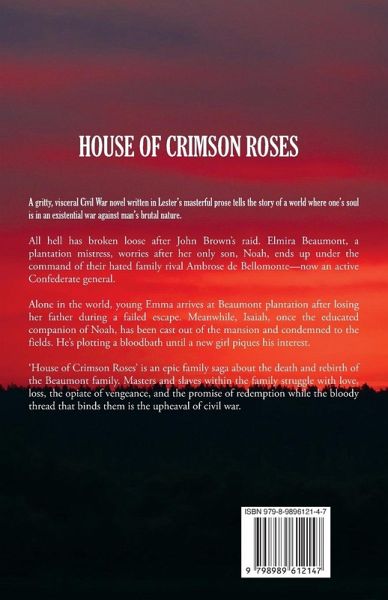 A gritty, visceral Civil War novel written in Lester's stark prose tells the story of a world where one's soul is in an existential war against man's brutal nature. All hell has broken loose after John Brown's raid. Elmira Beaumont, a plantation mistress, worries after her only son, Noah, ends up under the command of their hated family rival Ambrose de Bellomonte-now an active Confederate general. Alone in the world, young Emma arrives at Beaumont plantation after losing her father during a failed escape. Meanwhile, Isaiah, once the educated companion of Noah, has been cast out of the mansion and condemned to the fields. He's plotting a bloodbath until a new girl piques his interest. 'House of Crimson Roses' is an epic family saga about the death and rebirth of the Beaumont family. Masters and slaves within the family struggle with love, loss, the opiate of vengeance, and the promise of redemption while the bloody thread that binds them is the upheaval of civil war.