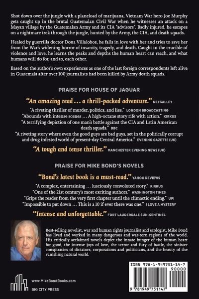 HOUSE OF JAGUAR: A tense, dangerous thriller of CIA operations and dirty wars in Latin America, guerrilla battles, drug flights, environmental catastrophes and genocides. Based on the author's own experiences as a war and human rights correspondent there. 1. ARCHETYPAL STORY OF LOVE AND DEATH: The intensity of love when any instant you can be killed. There is no safety anywhere, and any mistake could doom the person you love. 2. FEEL THE FEAR: What's it like to be hunted through the jungle, on foreign streets and in dirty barrios by endless faceless enemies? When you can never escape? 3. EXOTIC: Midnight landings on mountain roads, guerrilla encampments, the Mexican underworld and California rock stars. HOUSE OF JAGUAR puts you there. 4. AMERICA'S DIRTIEST WARS: HOUSE OF JAGUAR breaks the silence on the extensive war crimes perpetrated by US-backed military dictatorships in Central America. The author was the last foreign correspondent left in Guatemala when over 150 journalists had been killed by death squads, and worked thereafter as a human rights activist exposing US actions. See http://nyti.ms/1jWunDe 5. WE CAUSED IT BUT WE'RE INVISIBLE: Starting with the US overthrow of Guatemala's elected government in 1954, the US plunged that country into 45 years of civil wars and genocides. The present trial of ex-dictator Rios Montt has focused on numerous atrocities committed with the support of the Reagan administration, but the US has not even been cited in the trial. 6. HISTORICAL THRILLER: House of Jaguar is the core of Tikal, Guatemala's ancient city civilization. What was it like? 7. JUNGLE LIFE: The animals, trees, insects, the intensity of verdant thriving beings. The author traveled many miles of jungle and paddled many wild rivers and streams. HOUSE OF JAGUAR puts you there. 8. DOES THE US TORTURE? What really happens inside the torture cells, the US covert groups, and genocidal Army units? HOUSE OF JAGUAR puts you there. 9. KILLING CHRIST'S MESSENGERS: Why exterminate the Catholic clergy too? HOUSE OF JAGUAR tells why. 10. THE SIX HOUSES OF HELL: House of Jaguar is the first of the six Mayan houses of Hell. Primeval myths and Mayan memories powerfully influence many Guatemalans. Are they a metaphor for what we've done? 11. BEFORE THE FIRING SQUAD: Will you want the blindfold as they tie you to the bullet-splintered bloody pole and you look down the barrels of the waiting guns? HOUSE OF JAGUAR puts you there. 12. A DOLLAR A DAY IS PLENTY OF PAY: The role of US fruit companies in stamping out democracy in Central America. HOUSE OF JAGUAR tells how. 13. WANT MORE WEAPONS? You're a military dictatorship and the CIA wants to give you more weapons but you're so evil that Congress has suspended military aid. How does the CIA get you the weapons anyway? HOUSE OF JAGUAR explains how. 14. YOU HAVE 30 SECONDS TO LIVE: You've just been grabbed off the street by a death squad and thrown into a Black Maria. In 30 seconds they'll pull up on a side street, drag you out and cut your throat. What are your last thoughts? 15. EXTERMINATING THE RAIN FOREST: Can we protect the last vestiges of rain forest in Central America? And their magnificent animals?