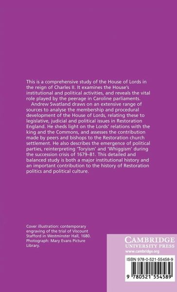 This is the first comprehensive study of the House of Lords in the reign of Charles II. It examines the House's institutional and political activities, and reveals the vital role played by the peerage in Caroline parliaments. Andrew Swatland draws on an extensive range of sources to analyse the membership and procedural developments of the House of Lords, relating these to legislative, judicial and political issues in Restoration England. He sheds light on the Lords' relations with the king and the Commons, and assesses the contribution made by peers and bishops to the Restoration church settlement. He also describes the emergence of political parties, reinterpreting 'Toryism' and 'Whiggism' during the succession crisis of 1679-81. This detailed and balanced study is both a major institutional history and an important contribution to the history of Restoration politics and political culture.