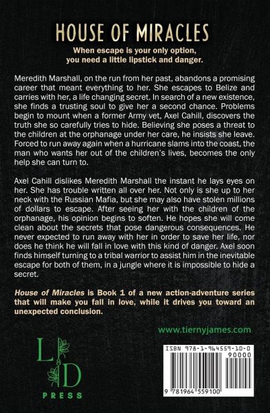 When escape is your only option, you need a little lipstick and danger. Meredith Marshall, on the run from her past, leaves a promising career behind. She carries a life changing secret to Belize in search of a new existence and finds a trusting soul to give her a second chance. Problems begin to mount when a former Army vet, Axel Cahill, discovers the truth she so carefully tries to hide. She realizes he believes she poses a threat to the children at the orphanage she promises to protect. He insists she leave. She is forced to run away again when a hurricane slams into the coast. This time, the man who wants her out of children's lives is the only help she can turn to. Axel Cahill dislikes Meredith Marshall the instant he lays eyes on her. She has trouble written all over her. Not only is she up to her neck with the Russian Mafia, but she may also have stolen millions of dollars to escape. After seeing her with the children of the orphanage, his opinion begins to soften, and he hopes she will come clean about the secrets that pose dangerous consequences. He doesn't expect to run away with her in order to save her life, nor does he think he will fall in love with danger. Axel soon finds himself turning to a tribal warrior to assist him in the inevitable escape. House of Miracles is Book 1 of a new action-adventure series that will make you fall in love, while it drives you toward an unexpected conclusion.