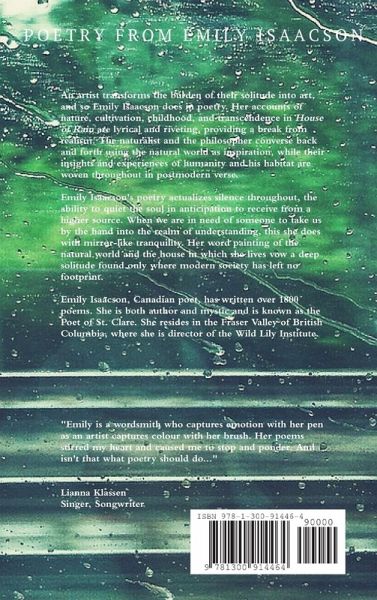 An artist transforms the burden of their solitude into art, and so Emily Isaacson does in poetry. Her accounts of nature, cultivation, childhood, and transcendence in House of Rain are lyrical and riveting, providing a contrast from realism. Some dominant themes include the comparison of nature to human nature, while the naturalist and the philosopher converse back and forth using their home in the natural world as inspiration. Their insights and experiences of humanity and his habitat are woven into the text in postmodern verse. Emily Isaacson's poetry actualizes silence throughout, the ability to quiet the soul in anticipation to receive from a higher source. Where we are in need of someone to take us by the hand into the realm of understanding, this she does with mirror-like tranquility. Her word painting of the natural world and the house in which she lives vow a deep solitude and serenity found only where modern society has left no footprint.