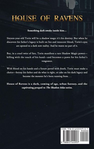 Something dark awoke inside him... Sixteen-year-old Torin will be a shadow mage; it's his destiny. But when he discovers his father's legacy is built on lies and innocent blood, Torin's eyes are opened to a dark new reality. And he wants no part of it. But, in a cruel twist of fate, Torin manifests a rare Shadow Magic power-killing with the touch of his hand-and becomes a pawn for his father's vengeance. With blood on his hands and a future paved with death, Torin must make a choice-betray his father and do what is right, or take on his dark legacy and become the monster he's been running from. . . House of Ravens is a dark, coming of age, urban fantasy, and the captivating prequel to The Shadow Atlas series.