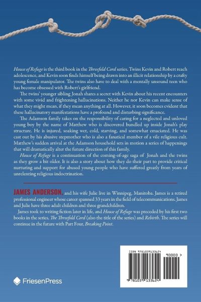 House of Refuge is the third book in the Threefold Cord series. Twins Kevin and Robert reach adolescence, and Kevin soon finds himself being drawn into an illicit relationship by a crafty young female manipulator. The twins also have to deal with a mentally unsound teen who has become obsessed with Robert's girlfriend. The twins' younger sibling Jonah shares a secret with Kevin about his recent encounters with some vivid and frightening hallucinations. Neither he nor Kevin can make sense of what they might mean, if they mean anything at all. However, it soon becomes evident that these hallucinatory manifestations have a profound and disturbing significance. The Adamson family takes on the responsibility of caring for a neglected and unloved young boy by the name of Matthew who is discovered bundled up inside Jonah's play structure. He is injured, soaking wet, cold, starving, and somewhat emaciated. He was cast out by his abusive stepmother who is also a fanatical member of a vile religious cult. Matthew's sudden arrival at the Adamson household sets in motion a series of happenings that will dramatically alter the future direction of this family. House of Refuge is a continuation of the coming-of-age saga of Jonah and the twins as they grow a bit older. It is also a story about how they do their part to provide critical nurturing and support for abused young people who have suffered greatly from years of unrelenting religious indoctrination.