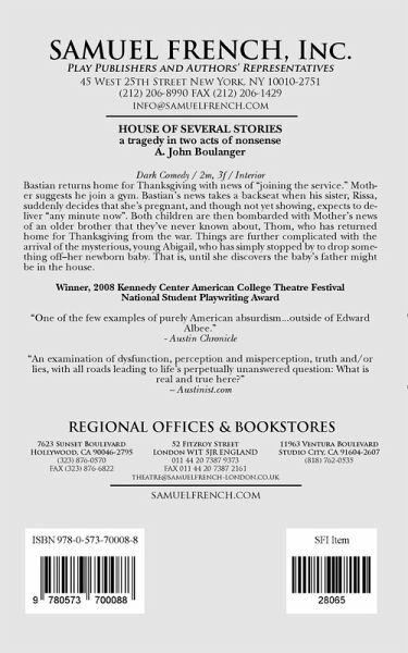 Genre: Dark Comedy Characters: 2m, 3f Scenery: Interior Bastian returns home for Thanksgiving with news of "joining the service." Mother suggests he join a gym. Bastian's news takes a backseat when his sister, Rissa, suddenly decides that she's pregnant, and though not yet showing, expects to deliver "any minute now". Both children are then bombarded with Mother's news of an older brother that they've never known about, Thom, who has returned home for Thanksgiving from the