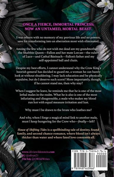 Dive into the first standalone spin-off of the bestselling series and Booktok sensation, The Kingdom of Crows. Cathal's story takes place right after the events of House of Striking Oaths and should be read in order. TWICE UPON A TIME, A PRINCESS FELL IN LOVE WITH A BEAST. I was reborn with no memory of my previous life and no powers, save for transforming into an aberration most wish eliminated. Among the few who don't wish me dead are the Shabbin Queen, Fallon and her mate Lorcan, and Cathal Báeinach-Fallon's father and my self-appointed sentry. Despite my best efforts, I cannot understand why the Crow King's boorish general has decided to guard me, a woman he can barely stand to look at. I may lack education and be physically unpleasing, but do I deserve such scorn? More importantly, though, if he's repulsed by me, then why stay? When I suggest he leave, he reminds me that he's one of the most lethal males in the realm. And while he may be that, he's also one of the most infuriating. A male who makes my blood run hot with equal measure irritation and lust. Why must I be drawn to the brute who loathes me? And why, when I forge a magical mind link to another male, must I keep hungering for the Crow who-finally-left? House of Shifting Tides is a spellbinding tale of destiny, found family, and second chance romance, where blood isn't always thicker than water and where fated love consumes all.
