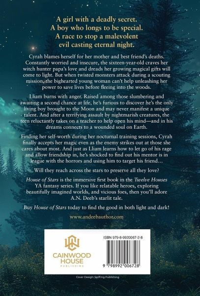 A girl with a deadly secret. A boy who longs to be special. A race to stop a malevolent evil casting eternal night. Cyrah blames herself for her mother and best friend's deaths. Constantly worried and insecure, the sixteen-year-old craves her witch hunter papa's love and dreads her growing magical gifts will come to light. But when twisted monsters attack during a scouting mission, the bighearted young woman can't help unleashing her power to save lives before fleeing into the woods. Lliam burns with anger. Raised among those slumbering and awaiting a second chance at life, he's furious to discover he's the only living boy brought to the Moon and may never manifest a unique talent. And after a terrifying assault by nightmarish creatures, the teen reluctantly takes on a teacher to help open his mind-and in his dreams connects to a wounded soul on Earth. Finding her self-worth during her nocturnal training sessions, Cyrah finally accepts her magic even as the enemy strikes out at those she cares about most. And just as Lliam learns how to let go of his rage and allow friendship in, he's shocked to find out his mentor is in league with the horrors and using him to target his friend... Will they reach across the stars to preserve all they love? House of Stars is the immersive first book in the House of Stars YA fantasy series. If you like relatable heroes, exploring beautifully imagined worlds, and vicious foes, then you'll adore A.N. Deeb's starlit tale. Buy House of Stars today to find the good in both light and dark!