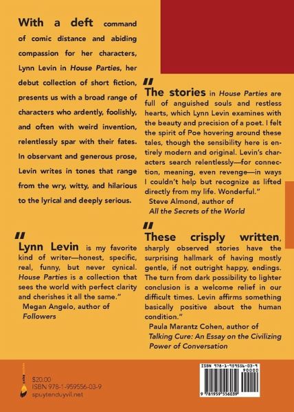 With a deft command of comic distance and abiding compassion for her characters, Lynn Levin in House Parties, her debut collection of short fiction, presents us with a broad range of characters who ardently, foolishly, and often with weird invention, relentlessly spar with their fates. Three friends hike through Yosemite in search of an awe-inspiring waterfall that may or may not exist...a girl on a high-school science trip finds herself abandoned on an island inhabited by aggressive monkeys...a lonely young rabbinical student creates and animates a female form only to see her beloved creature acquire free will...overwhelmed by surveys, an office worker rebels à la Bartleby...a couple believes that a move to a friendly and sophisticated exurban neighborhood will set the stage for happy marriage. Many of the characters in House Parties see themselves with a certain bemused humor and strive to stay self-possessed even as they struggle against the strange and undeserved things that happen to them. At other times, the characters-sometimes successfully, sometimes not-keep trying to escape the gravity of a plight they created or a problem they refuse to resolve. In observant and generous prose, Levin writes in tones that range from the wry, witty, and hilarious to the lyrical and deeply serious.