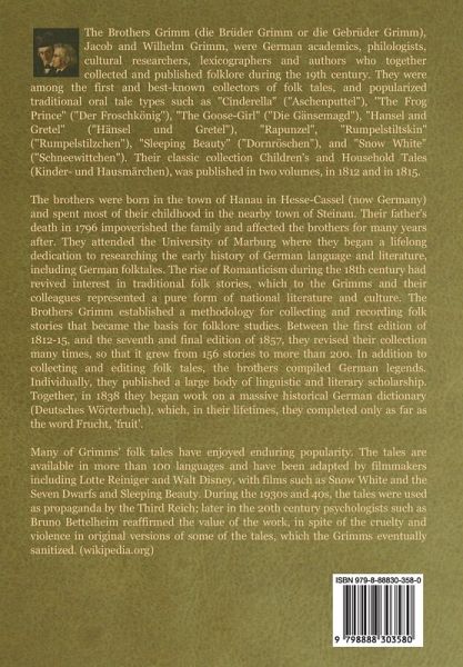Children's and Household Tales (German: Kinder- und Hausmärchen) is a collection of German origin fairy tales first published in 1812 by Jacob and Wilhelm Grimm, the Brothers Grimm. The collection is commonly known today as Grimm's Fairy Tales (German: Grimms Märchen). The influence of the book was widespread. W. H. Auden praised it, during World War II, as one of the founding works of Western culture... About The Brothers Grimm: The Brothers Grimm (die Brüder Grimm or die Gebrüder Grimm), Jacob and Wilhelm Grimm, were German academics, philologists, cultural researchers, lexicographers and authors who together collected and published folklore during the 19th century. They were among the first and best-known collectors of folk tales, and popularized traditional oral tale types such as "Cinderella" ("Aschenputtel"), "The Frog Prince" ("Der Froschkönig"), "The Goose-Girl" ("Die Gänsemagd"), "Hansel and Gretel" ("Hänsel und Gretel"), "Rapunzel", "Rumpelstiltskin" ("Rumpelstilzchen"), "Sleeping Beauty" ("Dornröschen"), and "Snow White" ("Schneewittchen"). Their classic collection Children's and Household Tales (Kinder- und Hausmärchen), was published in two volumes, in 1812 and in 1815. The brothers were born in the town of Hanau in Hesse-Cassel (now Germany) and spent most of their childhood in the nearby town of Steinau. Their father's death in 1796 impoverished the family and affected the brothers for many years after. They attended the University of Marburg where they began a lifelong dedication to researching the early history of German language and literature, including German folktales. The rise of Romanticism during the 18th century had revived interest in traditional folk stories, which to the Grimms and their colleagues represented a pure form of national literature and culture. The Brothers Grimm established a methodology for collecting and recording folk stories that became the basis for folklore studies. Between the first edition of 1812-15, and the seventh and final edition of 1857, they revised their collection many times, so that it grew from 156 stories to more than 200. In addition to collecting and editing folk tales, the brothers compiled German legends. Individually, they published a large body of linguistic and literary scholarship. Together, in 1838 they began work on a massive historical German dictionary (Deutsches Wörterbuch), which, in their lifetimes, they completed only as far as the word Frucht, 'fruit'. Many of Grimms' folk tales have enjoyed enduring popularity. The tales are available in more than 100 languages and have been adapted by filmmakers including Lotte Reiniger and Walt Disney, with films such as Snow White and the Seven Dwarfs and Sleeping Beauty. During the 1930s and 40s, the tales were used as propaganda by the Third Reich; later in the 20th century psychologists such as Bruno Bettelheim reaffirmed the value of the work, in spite of the cruelty and violence in original versions of some of the tales, which the Grimms eventually sanitized. (wikipedia.org)