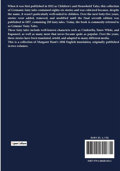When it was first published in 1812 as Children¿s and Household Tales, this collection of Germanic fairy tales contained eighty-six stories and was criticized because, despite the name, it wasn¿t particularly well-suited to children. Over the next forty-five years, stories were added, removed, and modified until the final seventh edition was published in 1857, containing 210 fairy tales. Today, the book is commonly referred to as Grimms¿ Fairy Tales. These fairy tales include well-known characters such as Cinderella, Snow White, and Rapunzel, as well as many more that never became quite as popular. Over the years, these stories have been translated, retold, and adapted to many different media. This is a collection of Margaret Hunt¿s 1884 English translation, originally published in two volumes.
