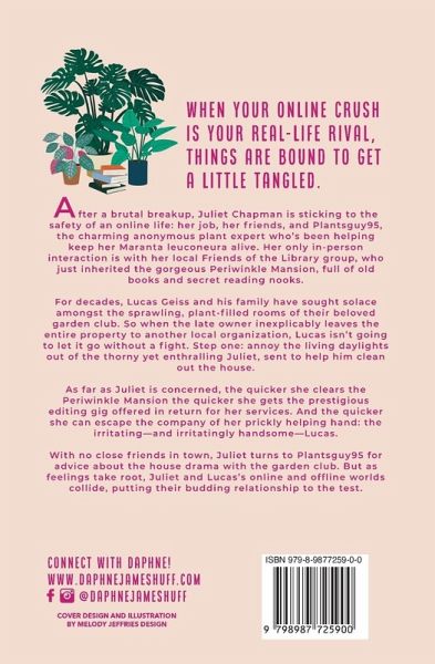 When your online crush is your real-life rival, things are bound to get a little tangled. After a brutal breakup, Juliet Chapman is sticking to the safety of an online life: her job, her friends, and Plantsguy95, the charming anonymous plant expert who's been helping keep her Maranta leuconeura alive. Her only in-person interaction is with her local Friends of the Library group, who just inherited the gorgeous Periwinkle Mansion, full of old books and secret reading nooks. For decades, Lucas Geiss and his family have sought solace amongst the sprawling, plant-filled rooms of their beloved garden club. So when the late owner inexplicably leaves the entire property to another local organization, Lucas isn't going to let it go without a fight. Step one: annoy the living daylights out of the thorny yet enthralling Juliet, sent to help him clean out the house. As far as Juliet is concerned, the quicker she clears the Periwinkle Mansion the quicker she gets the prestigious editing gig offered in return for her services. And the quicker she can escape the company of her prickly helping hand: the irritating-and irritatingly handsome-Lucas. With no close friends in town, Juliet turns to Plantsguy95 for advice about the house drama with the garden club. But as feelings take root, Juliet and Lucas's online and offline worlds collide, putting their budding relationship to the test.