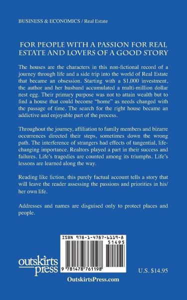 FOR PEOPLE WITH A PASSION FOR REAL ESTATE AND LOVERS OF A GOOD STORY. The houses are the characters in this non-fictional record of a journey through life and a side trip into the world of Real Estate that became an obsession. Starting with a $1,000 investment, the author and her husband accumulated a multi-million dollar nest egg. Their primary purpose was not to attain wealth but to find a house that could become "home" as needs changed with the passage of time. The search for the right house became an addictive and enjoyable part of the process. Throughout the journey, affiliation to family members and bizarre occurrences directed their steps, sometimes down the wrong path. The interference of strangers had effects of tangential, life-changing importance. Realtors played a part in their success and failures. Life's tragedies are counted among its triumphs. Life's lessons are learned along the way. Reading like fiction, this purely factual account tells a story that will leave the reader assessing the passions and priorities in his/her own life. Addresses and names are disguised only to protect places and people.