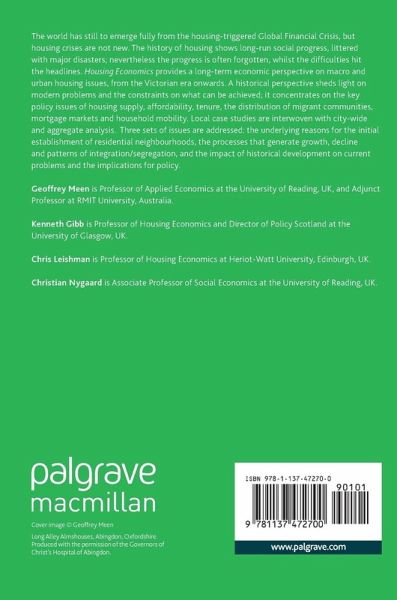 The world has still to emerge fully from the housing-triggered Global Financial Crisis, but housing crises are not new. The history of housing shows long-run social progress, littered with major disasters; nevertheless the progress is often forgotten, whilst the difficulties hit the headlines. Housing Economics provides a long-term economic perspective on macro and urban housing issues, from the Victorian era onwards. A historical perspective sheds light on modern problems and the constraints on what can be achieved; it concentrates on the key policy issues of housing supply, affordability, tenure, the distribution of migrant communities, mortgage markets and household mobility. Local case studies are interwoven with city-wide aggregate analysis. Three sets of issues are addressed: the underlying reasons for the initial establishment of residential neighbourhoods, the processes that generate growth, decline and patterns of integration/segregation, and the impact of historical development on current problems and the implications for policy.