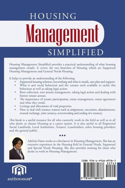 The book provides a practical understanding of what Housing Management entails. It covers the two branches of Housing which are Supported housing management and General needs housing. It helps to provide an understanding of the followings: 1. Supported housing schemes, keyworking andwhat it entails; care plan and support. 2. What is anti social behaviour, variuos tools available to tackle this behaviour as well as taking legal action. 3. Rent collection, rent arrears management, taking legal action and dealing with former tenant arrears. 4. The importance of tenant participation, estate management, estate agreement and what they entail. 5. Lettings and allocations of void properties. 6. How to deal with various tenancy matters such as assignment, succession, abandonment, mutual exchange, joint tenancies, overcrowding and ending of a tenancy. The book is useful to all who currently work in the field, as well as to those who have a desire to choose housing as their career. It is also useful to all tenants, leaseholders and freeholders.