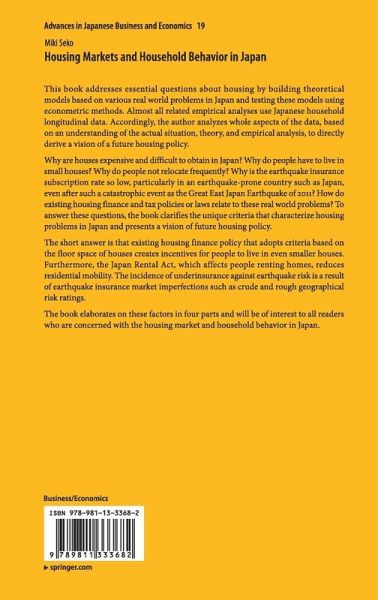Chapter 1 Introduction: Purpose and Organization of This Book.- Part I Housing Markets and the Macro Economy.- Chapter 2 House-Price Dynamics and Effects on the Macro Economy.- Chapter 3 Housing Market Imperfections and Distortions Resulting from Criteria Based on House Floor Space.- Chapter 4 Housing and Housing Finance Markets.- Part II Housing Tenure and Changes in Economic Welfare.- Chapter 5 Effects of Systems and Regulations on Residential Mobility.- Chapter 6 Housing Tenure Choice After the Revision of the Rental Act.- Chapter 7 The Term Premium of Cancellable Lease Rates.- Part III Earthquake Risk and the Residential Market.- Chapter 8 Earthquake Risk and a Quality of Life Index.- Chapter 9 Valuation of Earthquake Risk in Housing Markets.- Chapter 10 Consumer Valuation of Earthquake Risk before and after Massive Earthquakes.- Chapter 11 Earthquake Insurance Subscription Rates and Regional Cross-Subsidies.- Part IV Households' Behavioral Responses after the Great East Japan Earthquake.- Chapter 12 Perceived Preparedness and Attitude of Japanese Households toward Risk Mitigation Activities following the Great East Japan Earthquake: Earthquake Insurance Purchase and Seismic Retrofitting.- Chapter 13 Households' Risk Mitigation Activities and Risk Perception Bias: Earthquake Insurance Purchase and Seismic Retrofitting.- Part V Policy Implications of This Book.- Chapter 14 Conclusion: Policy Implications and Future Research.- Index.