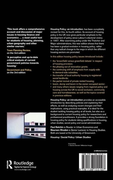 Housing Policy: An Introduction, has been completely revised for its fourth edition. Describing and explaining policies, as well as analysing recent changes, this book provides an accessible introduction to housing policy.