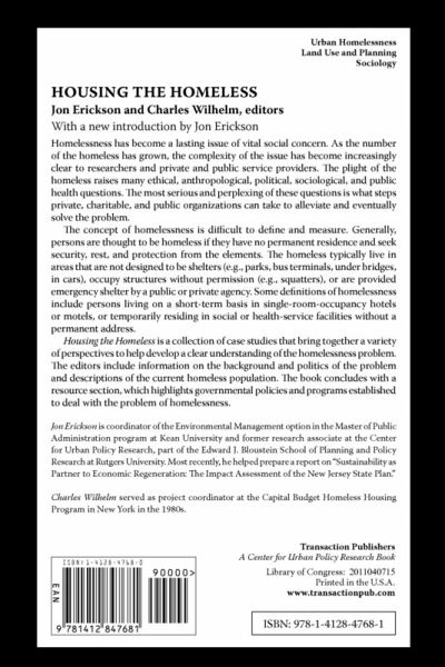Homelessness has become a lasting issue of vital social concern. As the number of the homeless has grown, the complexity of the issue has become increasingly clear to researchers and private and public service providers. The plight of the homeless raises many ethical, anthropological, political, sociological, and public health questions. The most serious and perplexing of these questions is what steps private, charitable, and public organizations can take to alleviate and eventually solve the problem. The concept of homelessness is difficult to define and measure. Generally, persons are thought to be homeless if they have no permanent residence and seek security, rest, and protection from the elements. The homeless typically live in areas that are not designed to be shelters (e.g., parks, bus terminals, under bridges, in cars), occupy structures without permission (e.g., squatters), or are provided emergency shelter by a public or private agency. Some definitions of homelessness include persons living on a short-term basis in single-room-occupancy hotels or motels, or temporarily residing in social or health-service facilities without a permanent address. Housing the Homeless is a collection of case studies that bring together a variety of perspectives to help develop a clear understanding of the homelessness problem. The editors include information on the background and politics of the problem and descriptions of the current homeless population. The book concludes with a resource section, which highlights governmental policies and programs established to deal with the problem of homelessness.