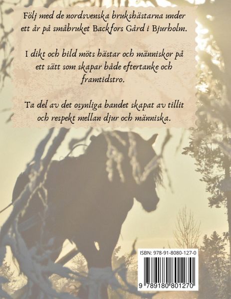 Med en poesi sprungen ur både nutid och dåtid får vi följa med på en resa som skapar både eftertanke och framtidstro. I dikt och bild beskriver Jonas Nordlund livet med sina arbetshästar på Backfors Gård i Bjurholm på ett starkt och träffande sätt. Bilderna är också både vackra och unika och följer likt dikterna årstiderna under ett år på gården.