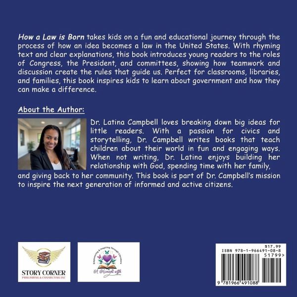 How a Law is Born takes kids on a fun and educational journey through the process of how an idea becomes a law in the United States. With rhyming text and clear explanations, this book introduces young readers to the roles of Congress, the President, and committees, showing how teamwork and discussion create the rules that guide us. Perfect for classrooms, libraries, and families, this book inspires kids to learn about government and how they can make a difference. About the Author: Dr. Latina Campbell loves breaking down big ideas for little readers. With a passion for civics and storytelling, Dr. Campbell writes books that teach children about their world in fun and engaging ways. When not writing, Dr. Latina enjoys building her relationship with God, spending time with her family, and giving back to her community. This book is part of Dr. Campbell's mission to inspire the next generation of informed and active citizens.