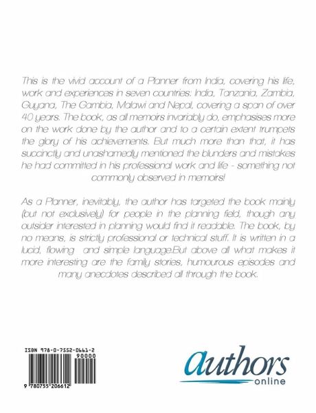This is the vivid account of a Planner from India, covering his life, work and experiences in seven countries: India, Tanzania, Zambia, Guyana, The Gambia, Malawi and Nepal, covering a span of over 40 years. The book, as all memoirs invariably do, emphasises more on the work done by the author and to a certain extent trumpets the glory of his achievements. But much more than that, it has succinctly and unashamedly mentioned the blunders and mistakes he had committed in his professional work and life - something not commonly observed in memoirs! As a Planner, inevitably, the author has targeted the book mainly (but not exclusively) for people in the planning field, though any outsider interested in planning would find it readable. The book, by no means, is strictly professional or technical stuff. It is written in a lucid, flowing and simple language.But above all what makes it more interesting are the family stories, humourous episodes and many anecdotes described all through the book.