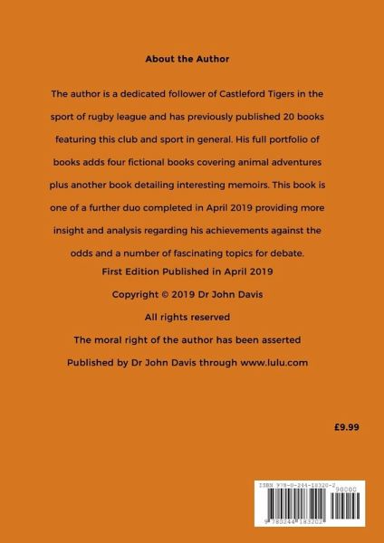 The author is a dedicated follower of Castleford Tigers in the sport of rugby league and has previously published 20 books featuring this club and sport in general. His full portfolio of books adds four fictional books covering animal adventures plus another book detailing interesting memoirs. This book is one of a further duo completed in early 2019 providing more insight and analysis regarding his achievements against the odds and a number of fascinating topics for debate.