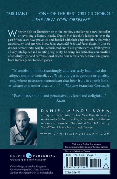 Whether he's on Broadway or at the movies, considering a new bestseller or revisiting a literary classic, Daniel Mendelsohn's judgments over the past fifteen years have provoked and dazzled with their deep erudition, disarming emotionality, and tart wit. Now, How Beautiful It Is and How Easily It Can Be Broken demonstrates why he is considered one of our greatest critics. Writing with a lively intelligence and arresting originality, he brings his distinctive combination of scholarly rigor and conversational ease to bear across eras, cultures, and genres, from Roman games to video games.