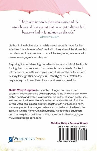 Life has its inevitable storms. While we all secretly hope for the fairy-tale "happily ever after," we instinctively dread the storm that can destroy all our dreams...or at the very least, leave us with overwhelming grief and despair. Preparing for and shielding ourselves from storms is half the battle. Facing them unprepared can have disastrous results. Packed with Scripture, real-life examples, and stories of the author's own journey through life's downpours, How Big is Your Umbrella? Helps equip us to weather all sorts of storms successfully. About the Author: Sheila Wray Gregoire is a speaker, blogger, and syndicated columnist whose passion is pointing people to the One who can restore broken hearts and broken relationships. The author of seven books, she tries to combine the realities of family and modern life with Scripture for real-world, real-biblical answers. Together with her husband Keith, she also speaks at marriage conferences and retreats. She lives in her Belleville, Ontario home with her husband, two teenage daughters, and a whole pile of unfinished knitting. You can find her blogging at www.sheilawraygregoire.com.