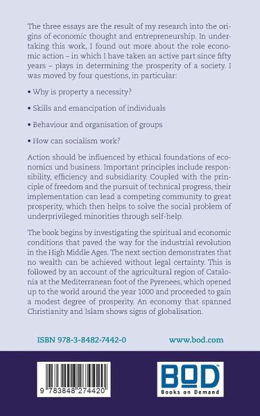 The three essays are the result of my research into the origins of economic thought and entrepreneurship. In undertaking this work, I found out more about the role economic action - in which I have taken an active part since fifty years - plays in determining the prosperity of a society. I was moved by four questions, in particular:- Why is property a necessity?- Skills and emancipation of individuals- Behaviour and organisation of groups- How can socialism work?Action should be influenced by ethical foundations of economics und business. Important principles include responsibility, efficiency and subsidiarity. Coupled with the principle of freedom and the pursuit of technical progress, their implementation can lead a competing community to great prosperity, which then helps to solve the social problem of underprivileged minorities through self-help.The book begins by investigating the spiritual and economic conditions that paved the way for the industrial revolution in the High Middle Ages. The next section demonstrates that no wealth can be achieved without legal certainty. This is followed by an account of the agricultural region of Catalonia at the Mediterranean foot of the Pyrenees, which opened up to the world around the year 1000 and proceeded to gain a modest degree of prosperity. An economy that spanned Christianity and Islam shows signs of globalisation.