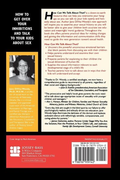 How Can We Talk About That? is a down-to-earth resource that can help you overcome your hang-ups so you can talk to your kids openly and honestly about sex. Author Jane DiVita Woody's new approach will inspire you to examine your sexual history so you will be better able to give your children both accurate sex education and meaningful moral guidance. Throughout the book she offers parents practical ideas for making changes and gaining the information and communication skills they need to guide the next generation toward sexual health. How Can We Talk About That? * Uncovers the powerful unconscious emotional barriers that block parents from discussing sex with their children * Helps parents understand and examine their own sexual history * Prepares parents for explaining to their children the sexual dimension of human life * Supplies the sexual information relevant to each developmental stage of a child's life * Teaches parents how to talk about sex in ways that their kids will understand and accept "Thanks to Dr. Woody, a certified sexologist, we now have a comprehensive guide to recommend to all parents, regardless of their social and religious backgrounds." --Jean D. Koehler, president-elect, the American Association of Sex Educators, Counselors, and Therapists "This provocative and helpful book gives parents the tools needed to talk about age-appropriate issues of sexuality with younger children and teenagers." --Ann L. Hanson, Minister for Children, Families and Human Sexuality Advocacy, Justice and Witness Ministries, United Church of Christ "Every day, kids are caught in the blind spot by our failure to offer psychologically realistic and ethically driven sex education. Jane Woody helps illuminate the darkness of this domain and replaces awkward silence with refreshingly sensible, compassionate, and caring advice for parents." --James Garbarino, author, Parents Under Siege: Why You are the Solution, Not the Problem, in Your Child's Life and codirector, Family Life Development Center, Cornell University