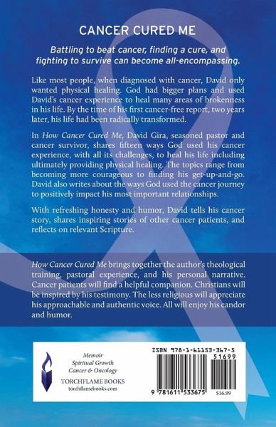 David Gira wants rightly to live but he knows that requires an account of what it means to live right. To live right requires honest candor. That is what he has given us in this book. Pain is here but then also is laughter. You can give this book to others. -- Stanley Hauerwas, Gilbert T. Rowe Professor Emeritus of Divinity and Law, Duke Divinity School Battling to beat cancer, finding a cure, and fighting to survive can become all-encompassing. Like most people, when diagnosed with cancer, David only wanted physical healing. God had bigger plans and used David's cancer experience to heal many areas of brokenness in his life. By the time of his first cancer-free report, two years later, his life had been radically transformed. In How Cancer Cured Me, David Gira, seasoned pastor and cancer survivor, shares fifteen ways God used his cancer experience, with all its challenges, to heal his life in addition to ultimately providing physical healing. The topics range from becoming more courageous to finding his get-up-and-go. David also writes about the ways God used the cancer journey to positively impact his most important relationships. With refreshing honesty and humor, David tells his cancer story, shares inspiring stories of other cancer patients, and reflects on relevant Scripture. How Cancer Cured Me brings together the author's theological training, pastoral experience, and his personal narrative. Cancer patients will find a helpful companion. Christians will be inspired by his testimony. The less religious will appreciate his approachable and authentic voice. All will enjoy his candor and humor.