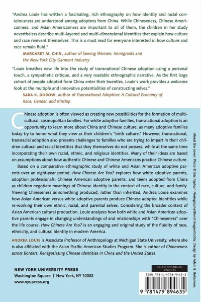 Chinese adoption is often viewed as creating new possibilities for the formation of multicultural, cosmopolitan families. For white adoptive families, it is an opportunity to learn more about China and Chinese culture, as many adoptive families today try to honor what they view as their children's "birth culture." However, transnational, transracial adoption also presents challenges to families who are trying to impart in their children cultural and racial identities that they themselves do not possess, while at the same time incorporating their own racial, ethnic, and religious identities. Many of their ideas are based on assumptions about how authentic Chinese and Chinese Americans practice Chinese culture. Based on a comparative ethnographic study of white and Asian American adoptive parents over an eight year period, How Chinese Are You? explores how white adoptive parents, adoption professionals, Chinese American adoptive parents, and teens adopted from China as children negotiate meanings of Chinese identity in the context of race, culture, and family. Viewing Chineseness as something produced, rather than inherited, Andrea Louie examines how the idea of "ethnic options" differs for Asian American versus white adoptive parents as they produce Chinese adoptee identities, while re-working their own ethnic, racial, and parental identities. Considering the broader context of Asian American cultural production, Louie analyzes how both white and Asian American adoptive parents engage in changing understandings of and relationships with "Chineseness" as a form of ethnic identity, racial identity, or cultural capital over the life course. Louie also demonstrates how constructions of Chinese culture and racial identity dynamically play out between parents and their children, and for Chinese adoptee teenagers themselves as they "come of age." How Chinese Are You? is an engaging and original study of the fluidity of race, ethnicity, and cultural identity in modern America.