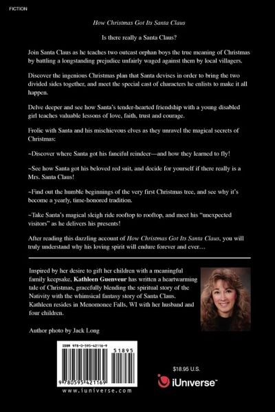 How Christmas Got Its Santa Claus Is there really a Santa Claus? Join Santa Claus as he teaches two outcast orphan boys the true meaning of Christmas by battling a longstanding prejudice unfairly waged against them by local villagers. Discover the ingenious Christmas plan that Santa devises in order to bring the two divided sides together, and meet the special cast of characters he enlists to make it all happen. Delve deeper and see how Santa's tender-hearted friendship with a young crippled girl teaches valuable lessons of love, faith, trust and courage. Frolic with Santa and his mischievous elves as they unravel the magical secrets of Christmas: ~Discover where Santa got his fanciful reindeer, and how they learned to fly! ~See how Santa got his beloved red suit, and decide for yourself, if there really is a Mrs. Santa Claus! ~Find out the humble beginnings of the very first Christmas tree and see why it's become a yearly time-honored tradition. ~Take Santa's magical sleigh ride rooftop to rooftop and Meet his "unexpected visitors," as he delivers his presents! After reading this dazzling account of, How Christmas Got Its Santa Claus, you will truly understand why his loving spirit will endure forever and ever.