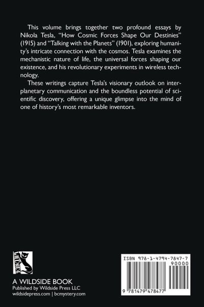 This volume brings together two profound essays by Nikola Tesla, "How Cosmic Forces Shape Our Destinies" (1915) and "Talking with the Planets" (1901), exploring humanity's intricate connection with the cosmos. Tesla examines the mechanistic nature of life, the universal forces shaping our existence, and his revolutionary experiments in wireless technology. These writings capture Tesla's visionary outlook on interplanetary communication and the boundless potential of scientific discovery, offering a unique glimpse into the mind of one of history's most remarkable inventors.