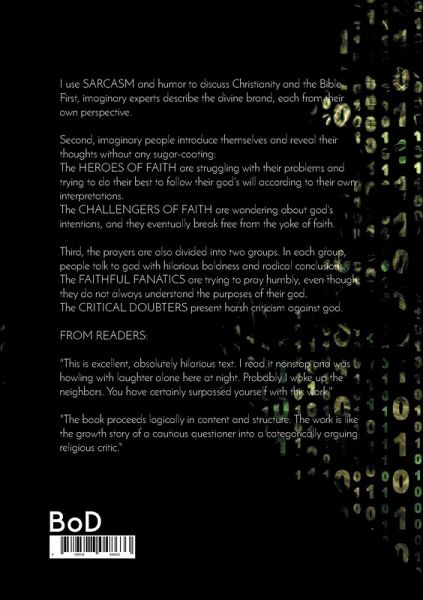 I use SARCASM and humor to discuss Christianity and the Bible.First, imaginary experts describe the divine brand, eachfrom their own perspective.Second, imaginary people introduce themselves and reveal theirthoughts without any sugar-coating:The HEROES OF FAITH are struggling with their problems and trying to do their best to follow their god's will according to their own interpretations.The CHALLENGERS OF FAITH are wondering about god's intentions, and they eventually break free from the yoke of faith.Third, the prayers are also divided into two groups. In each group, people talk to god with hilarious boldness and radical conclusions:The FAITHFUL FANATICS are trying to pray humbly, even though they do not always understand the purposes of their god.The CRITICAL DOUBTERS present harsh criticism against god.FROM READERS:"This is excellent, absolutely hilarious text. I read it nonstop and was howling with laughter alone here at night. Probably I woke up the neighbors. You have certainly surpassed yourself with this work.""The book proceeds logically in content and structure. The work is like the growth story of a cautious questioner into a categorically arguing religious critic."